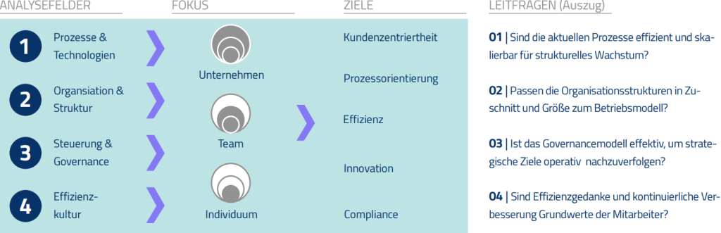 Zu Beginn legen wir den Fokus auf Ihre Aufbau- und Ablauforganisation, wo wir insbesondere die Ressourcenverteilung, Durchlaufzeiten, Verantwortlichkeiten und Tätigkeiten analysieren. Wir prüfen auch die grundsätzliche Ausrichtung Ihrer Organisation z.B. in Hinblick auf dezentrale oder zentrale Ausrichtungen einzelner Funktionen und begleiten Sie bei der Einführung eines End-2-End-Prozessmodells. Für reibungslose und fehlerfreie Abläufe sind insbesondere auch die Verfügbarkeit und Qualität der Daten wesentlich, sodass das Thema Datenmanagement sich in allen Phasen wiederfindet. Wir identifizieren gemeinsam mit Ihnen leitfragenbasiert Verbesserungsansätze. Für alle Auffälligkeiten schlagen wir Ihnen geeignete Lösungen vor. Zur Absicherung leiten wir max. 5 wesentliche Steuerungskennzahlen für Ihre Unternehmensstrategie ab, die Ihnen die nötige Transparenz für gute Entscheidungen bringen.